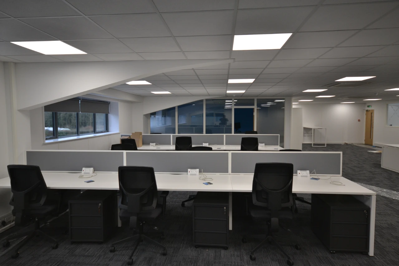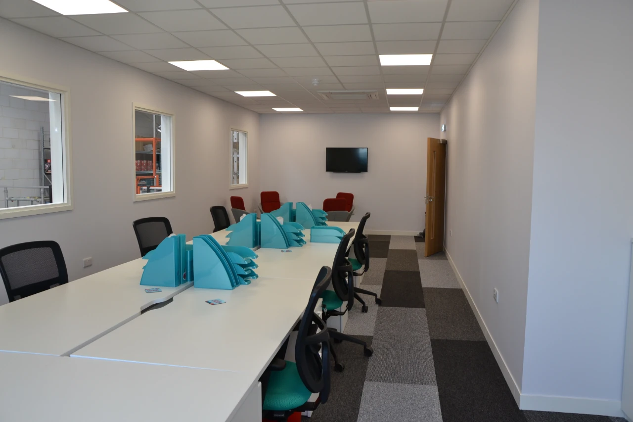Suspended ceilings were installed throughout the first-floor office area and a carpet was fitted to the ground floor reception lobby, staircase and ground and first floor offices. We also installed a power supply to the warehouse and mounted essential lighting.